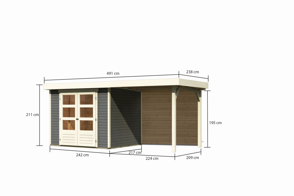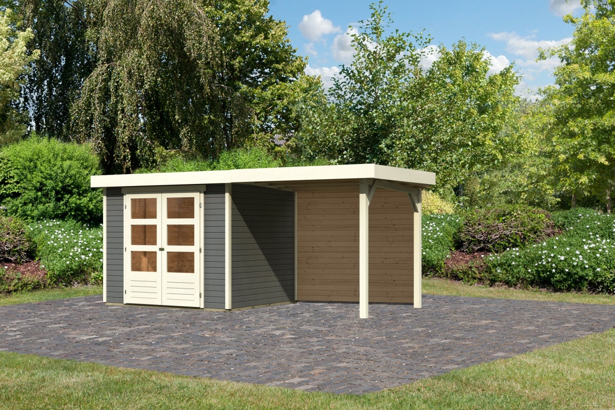 Tuinhuis Askira 3 met 2,4 meter verlengbaar dak en achterwand - Het accent in je tuin. De 19mm Systeemhuis gemaakt van Noordse spar In eenvoudige vorm Plug- en schroefsysteem is verkrijgbaar in de kleur Terra Grey.