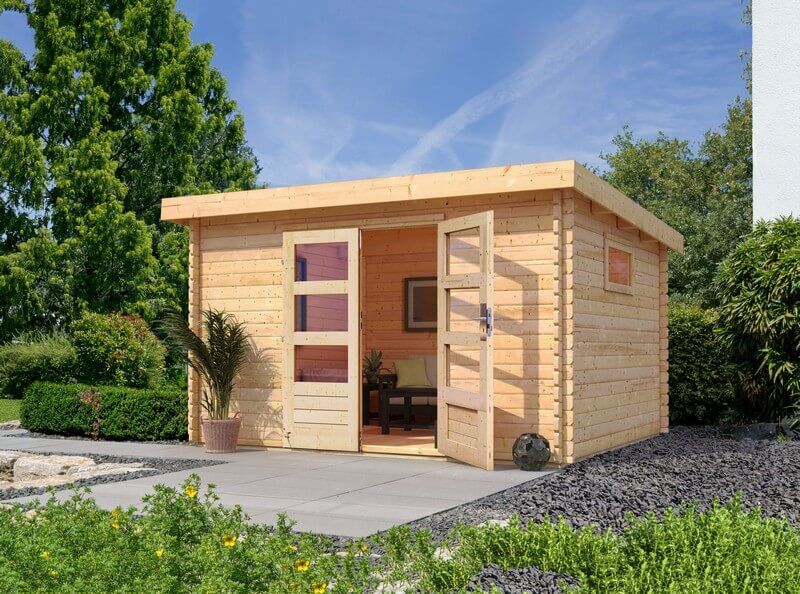- 28 mm: Möchtest Du im Sommer einen schattigen Platz genießen und vielleicht die lauen Sommernächte hier verbringen, dann solltest Du ein solches Gartenhaus kaufen. Die Wandstärke von 28 mm erlaubt einen großzügigen Gebäudegrundriss und bietet genügend Schutz vor der Witterung.