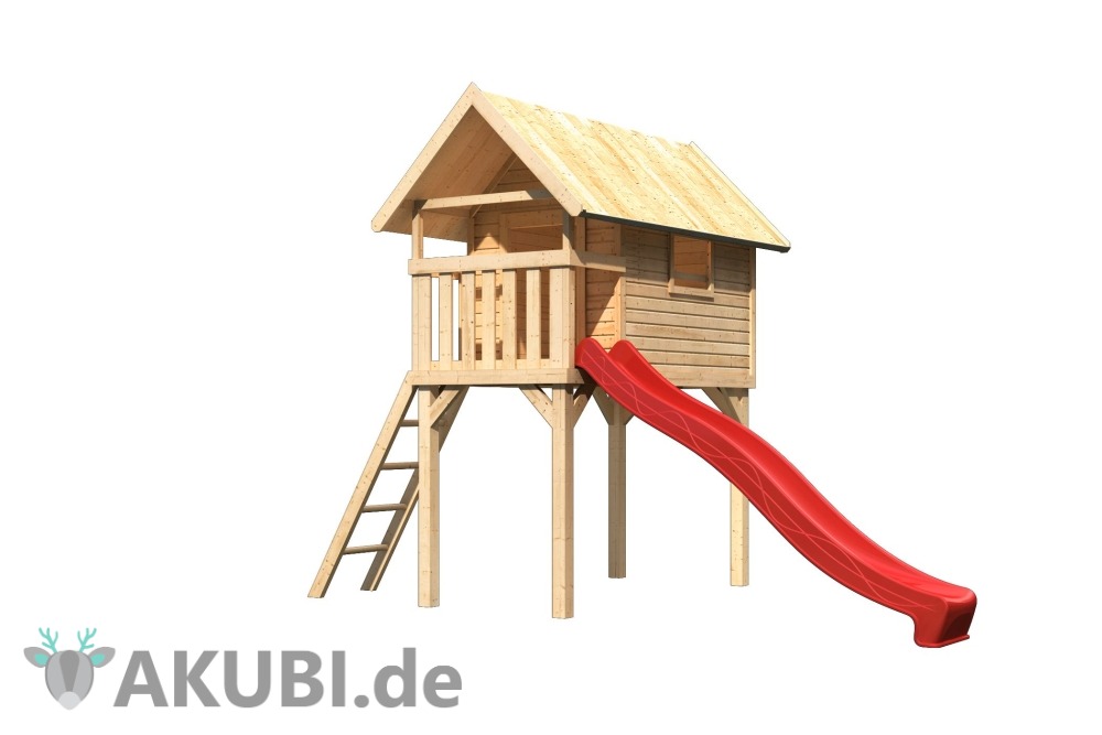 Erst ganz schnell aufs Stelzenhaus hinaufklettern und dann eine flotte Talabfahrt genießen? AKUBI macht’s möglich! Dank der aufeinander abgestimmten Produkte von AKUBI lässt sich an jedes Stelzenhaus aus Holz eine Rutsche aus Kunststoff montieren. Die Rutsche wird auf die Podesthöhe des Stelzenhauses abgestimmt und verspricht auf dem neuen Spielplatz im Außenbereich jede Menge Action und Bauchkribbeln. Damit wird das Stelzenhaus mit Rutsche zu einem spannenden Abenteuerhaus.